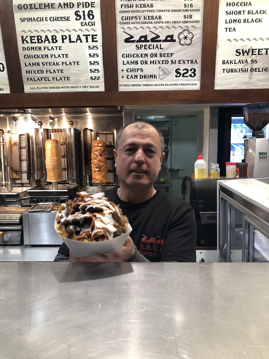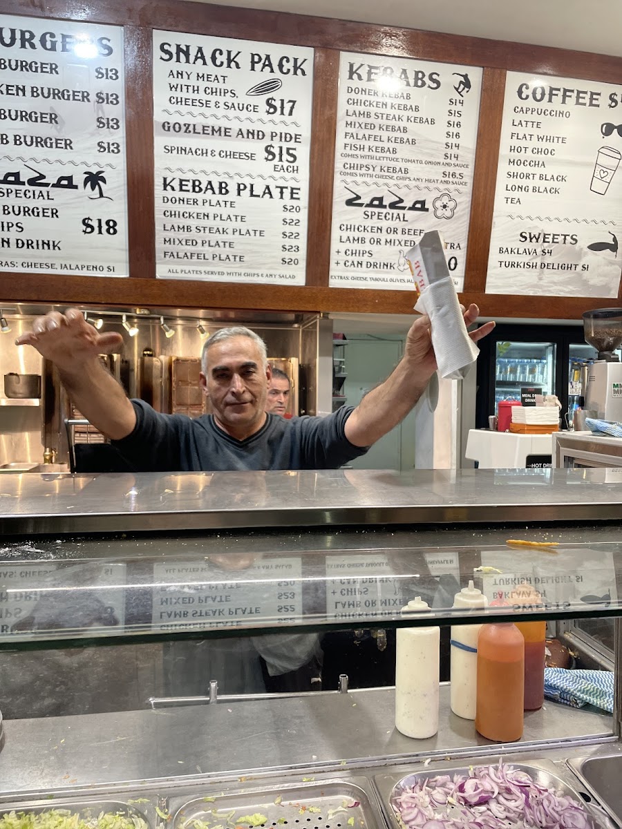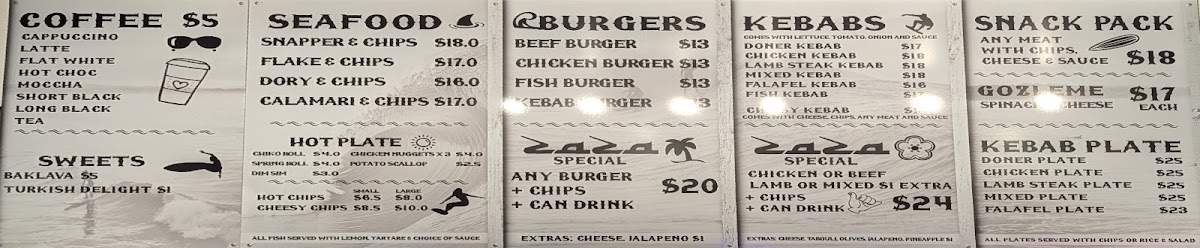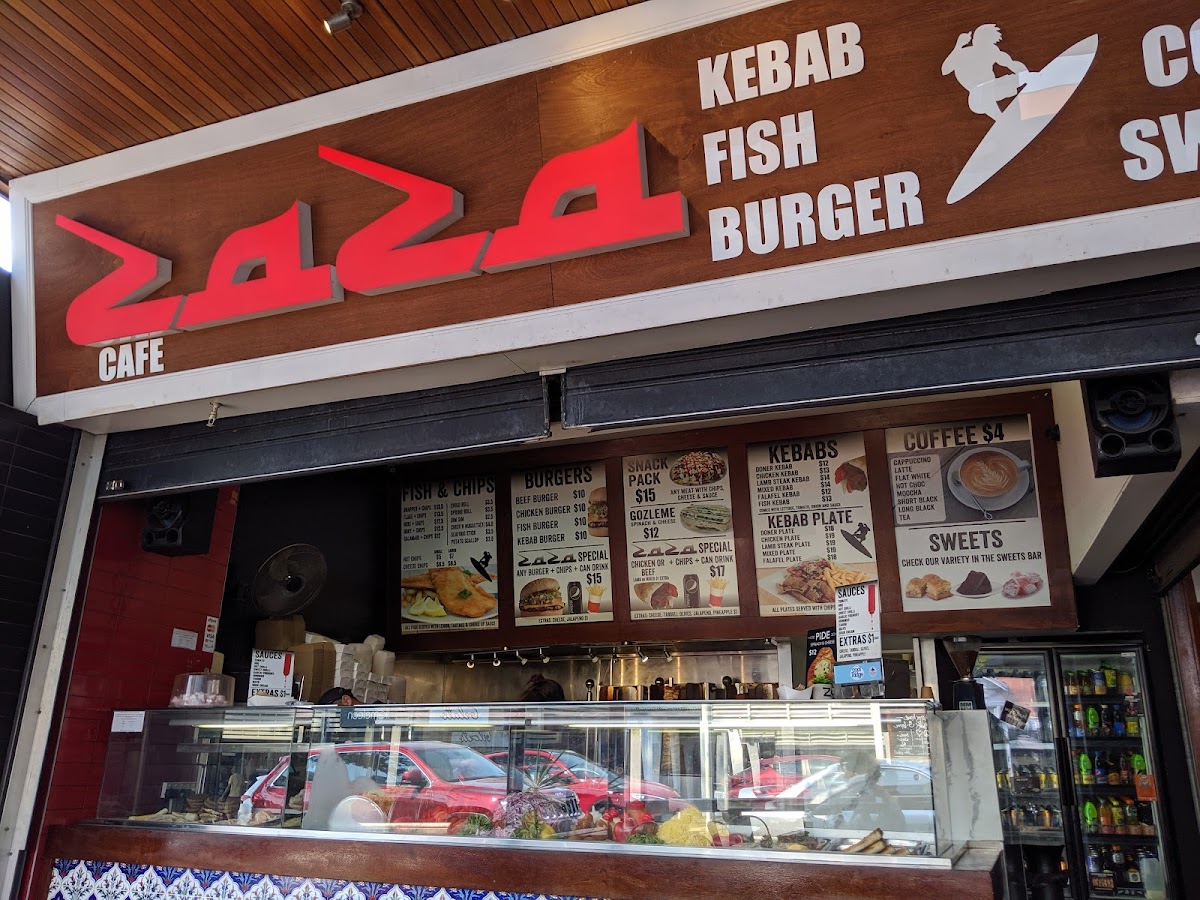 The menu at Zaza Kebabs in Byron Bay offers a delightful mix of Mediterranean-inspired dishes, with a range of kebabs, seafood, burgers, and comforting snacks. For those looking for a quick bite, the Doner Kebab and Chicken Kebab are standout choices, while the Lamb Steak Kebab and Mixed Kebab offer a more indulgent option. Vegetarians can enjoy the Falafel Kebab or the Spinach Cheese Gozleme. The Kebab Plates such as the Doner Plate and Chicken Plate are perfect for a hearty meal, served with a generous portion of sides. Seafood lovers can savor the crispy Snapper & Chips, Flake & Chips, or the tender Dory & Chips, while the Calamari & Chips is another tempting choice. If you're in the mood for a burger, the Beef Burger, Chicken Burger, and Fish Burger provide a satisfying variety. For those craving comfort food, try the Chiko Roll, Spring Roll, or Chicken Nuggets X3 from the Hot Plate section. To top it off, indulge in a sweet treat like Baklava or Turkish Delight. Don’t forget to pair your meal with a coffee - choose from classics like Cappuccino, Latte, or Flat White, or opt for a Hot Choc or Moccha. Whether you're in the mood for a quick snack or a full meal, Zaza Kebabs offers something for every taste.